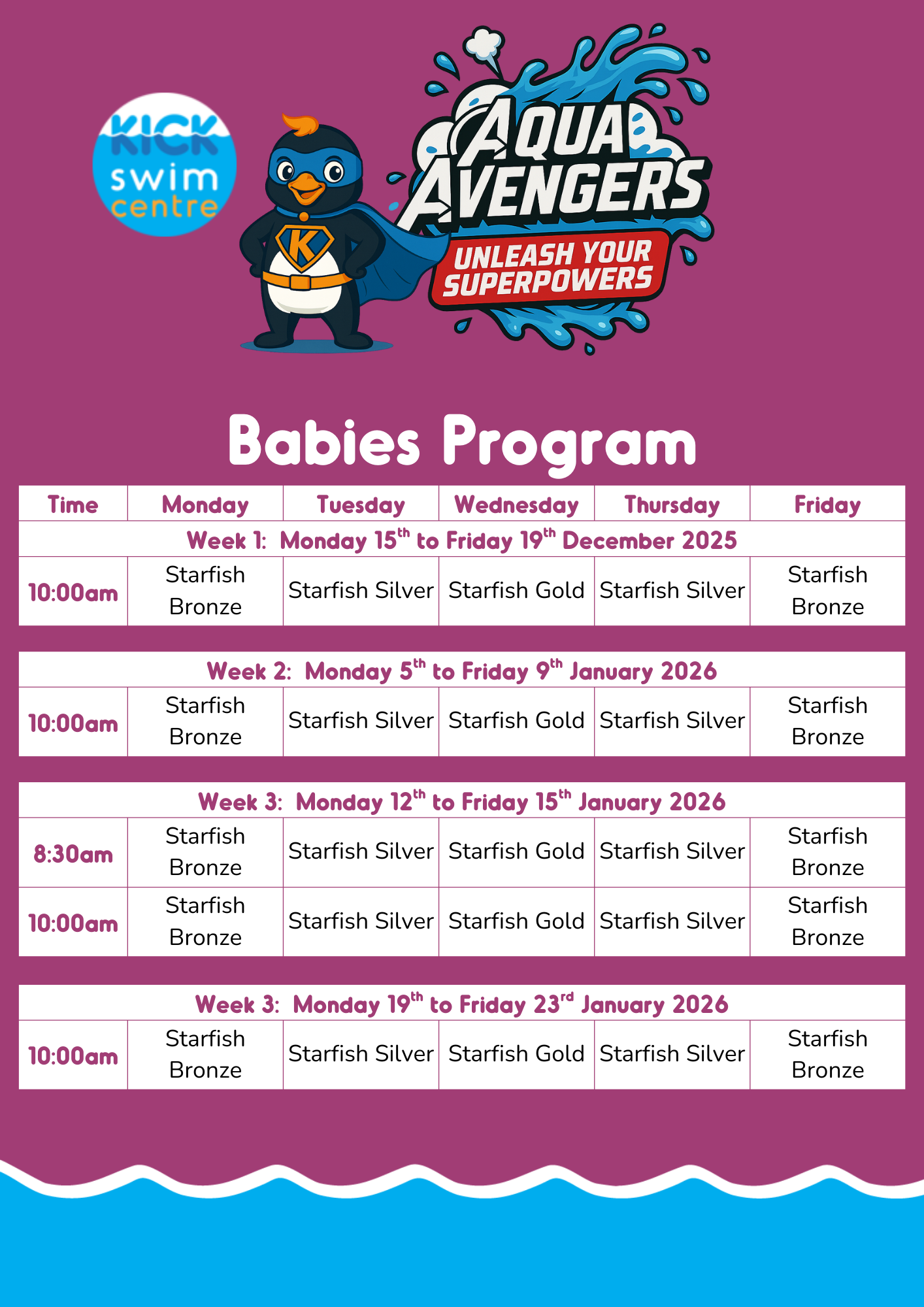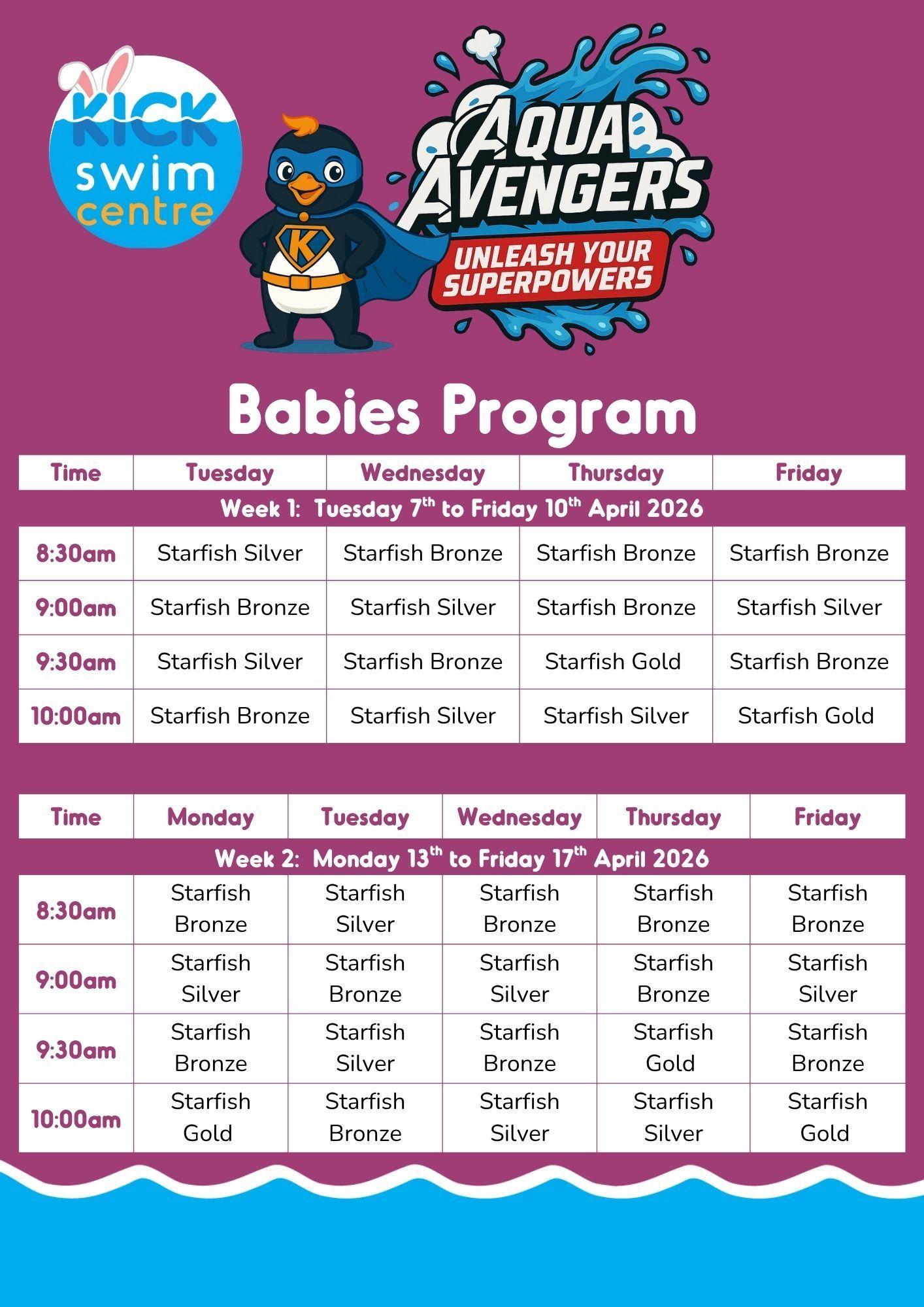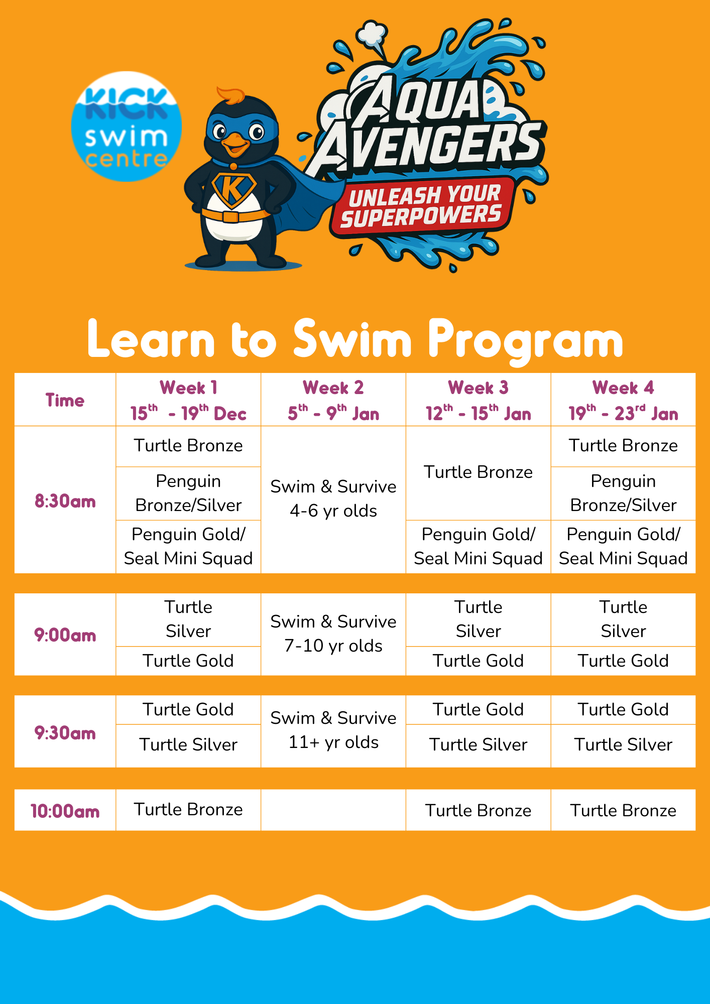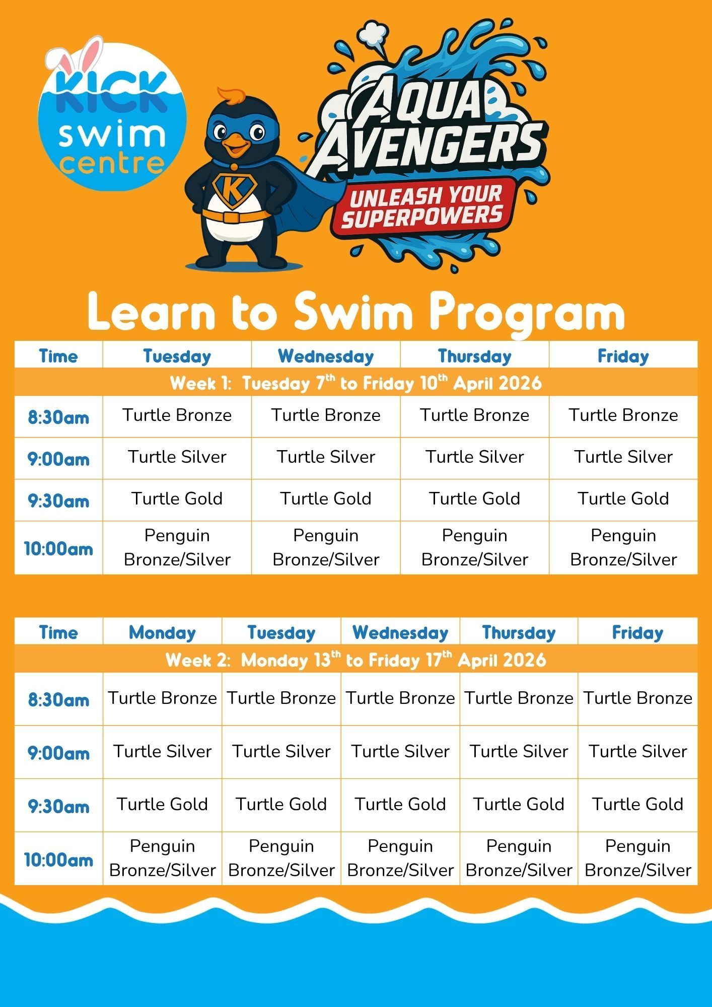 Our Aqua Avengers holiday programs produce great results! Holiday programs are a great way to consolidate progress made during the term. They are also beneficial for those kids (3 years +) ready to move up a level or who have just moved up a level. We have Holiday Programs for all levels, just call us 07 4128 4888 or email us herveybay@kickswim.com.au (Newcomers are welcome, but require an assessment to ensure placement in the correct level.)