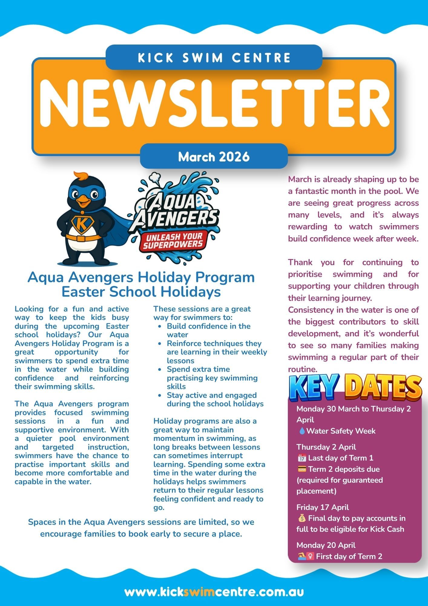 Our March Newsletter is now available, and it’s filled with updates, reminders and exciting activities happening at Kick Swim Centre.