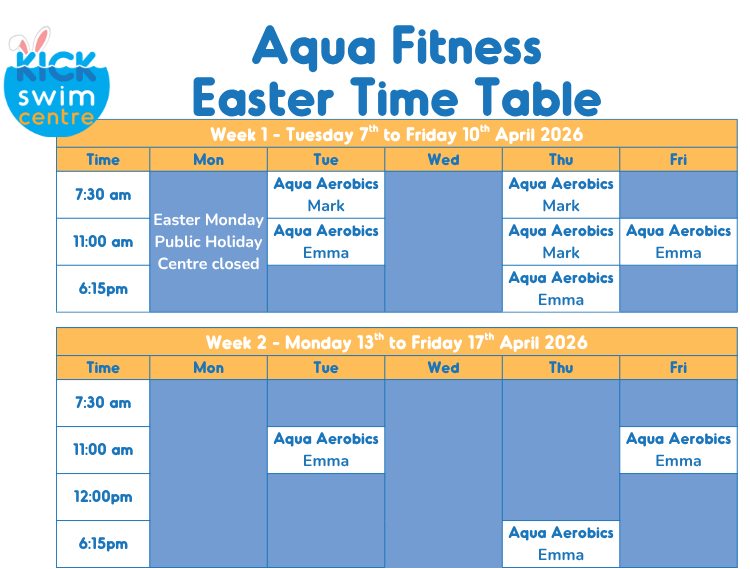 KICK Swim Centre holds weekly classes to help you get in shape. No booking is required. We have 2 types of classes to choose from Aqua Aerobics & Gentle Exercise. For more detail on these classes, click here.
